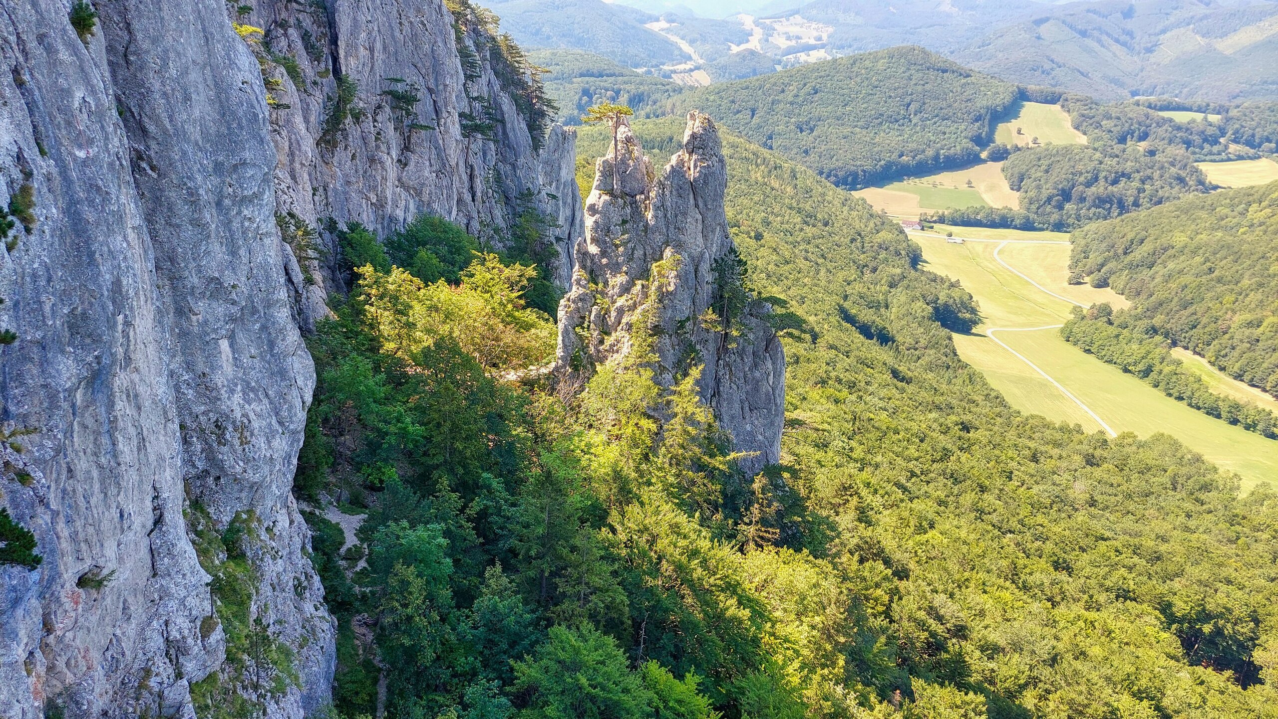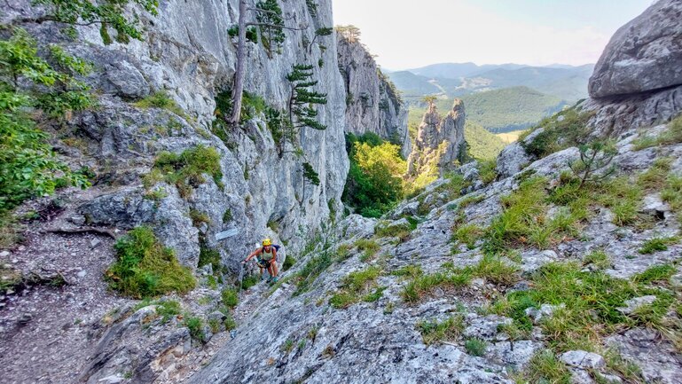 Najzaujímavejšou časťou výstupu bola úzka skalná rímsa, ktorá nás viedla popri strmej stene s nádhernými výhľadmi do údolia. Tu sa zastavil čas – aj keď bolo lezenie náročné, každý z nás si našiel chvíľu, aby obdivoval krásu prírody okolo nás.